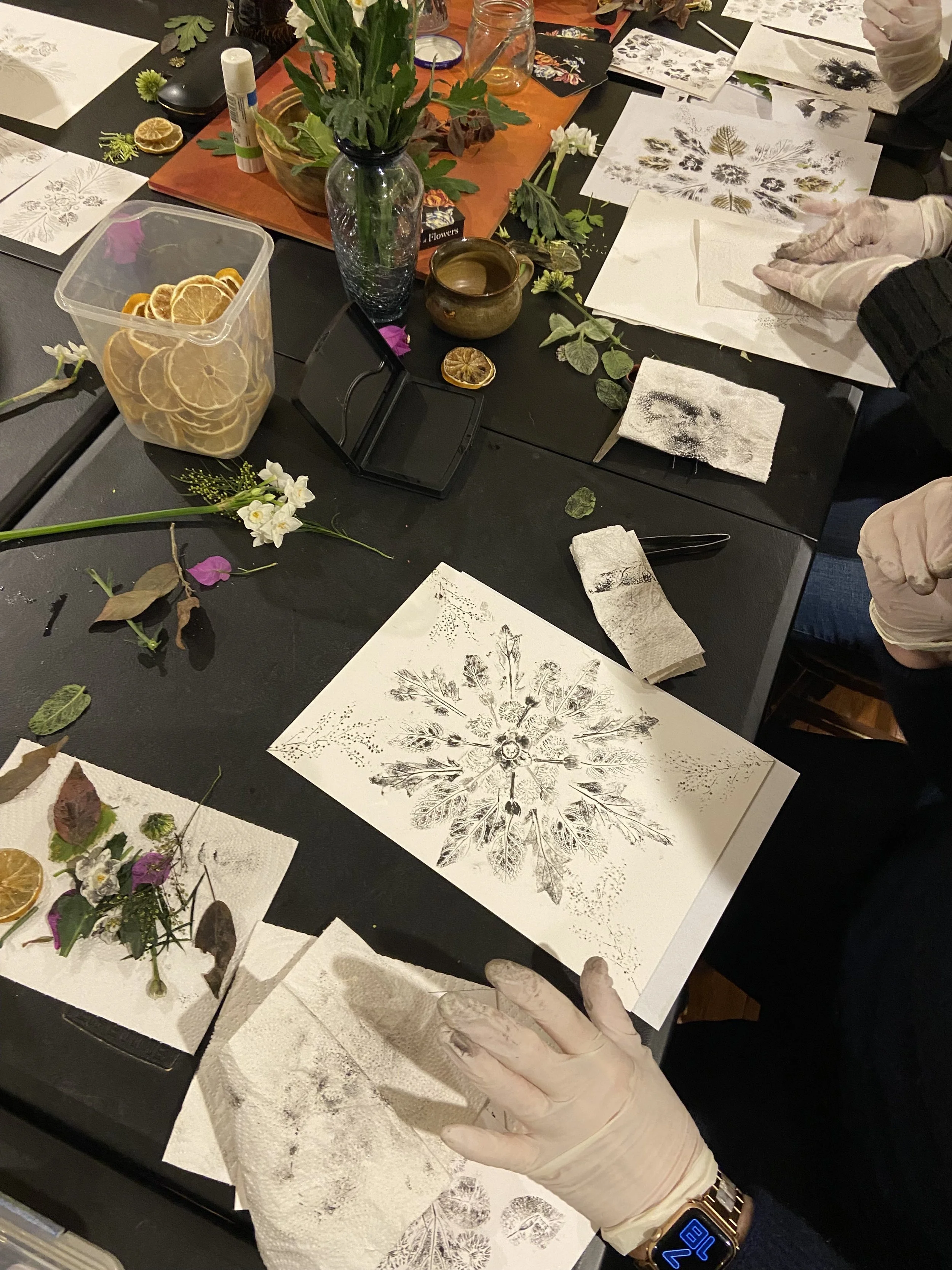 Participants are provided with all materials to design a botanical mandala print, using fresh flowers & foliage that will be pressed into ink and then transferred to thick artist paper stock.